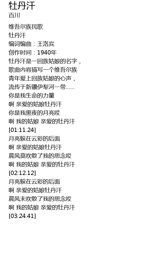 | [00:13.93] | 牡丹汗是一回族姑娘的名字, |