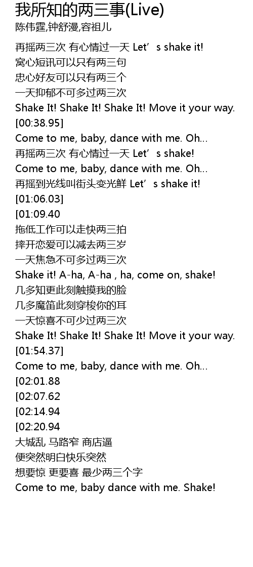 | [02:54.33][02:01.88] | 再摇两三次 有心情过一天 Let’s shake! |