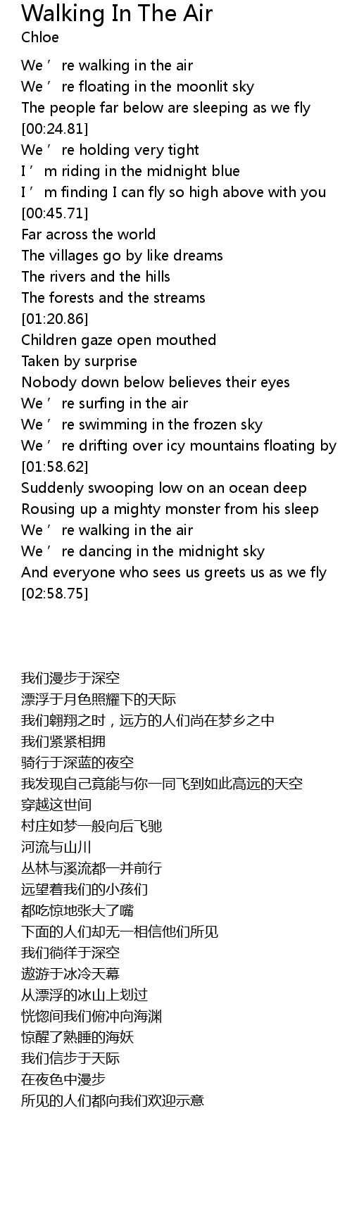 | [02:39.05] | We ’re walking in the air |
