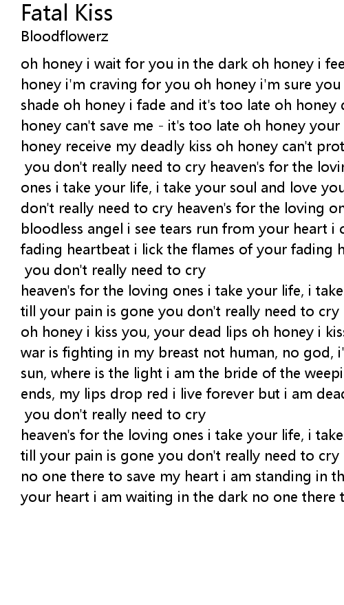 oh honey i wait for you in the dark oh honey i feel the beat of your heart oh honey i'm craving for you oh honey i'm sure you knew oh honey don't cry in the shade oh honey i fade and it's too late oh honey don't trust me, don't hate oh honey can't save me - it's too late oh honey your sweet taste i will miss oh honey receive my deadly kiss oh honey can't protect you from me oh honey my pain - you can't see [chorus:] you don't really need to cry heaven's for the loving ones i take your life, i take your soul and love you till your pain is gone you don't really need to cry heaven's for the loving ones no god in heaven, my bloodless angel i see tears run from your heart i count the strokes of your fading heartbeat i lick the flames of your fading heat in my torture i don't know mercy i am blessed with insanity [chorus:] you don't really need to cry heaven's for the loving ones i take your life, i take your soul and love you till your pain is gone you don't really need to cry heaven's for the loving ones oh honey i kiss you, your dead lips oh honey i kiss you, just a short bliss a war is fighting in my breast not human, no god, i'm fatally blessed where is the sun, where is the light i am the bride of the weeping night the night never ends, my lips drop red i live forever but i am dead i am doomed and blessed forever i feel the pain ever and ever [chorus:] you don't really need to cry heaven's for the loving ones i take your life, i take your soul and love you till your pain is gone you don't really need to cry heaven's for the loving ones no one there to save my heart i am standing in the dark see the tears run from your heart i am waiting in the dark no one there to save me |