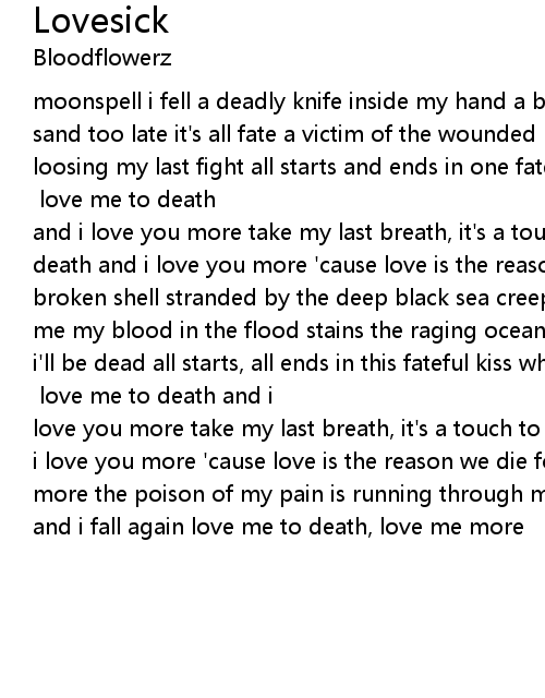 moonspell i fell a deadly knife inside my hand a bloody trace is drying in the sand too late it's all fate a victim of the wounded night i fade 'cause i am loosing my last fight all starts and ends in one fateful kiss when we once touch what we ever miss our endless quest has just begun [chorus:] love me to death and i love you more take my last breath, it's a touch to the core love me to death and i love you more 'cause love is the reason we die for moonspell a broken shell stranded by the deep black sea creeping fear gets deeper inside of me my blood in the flood stains the raging ocean red when the dawn is rising i'll be dead all starts, all ends in this fateful kiss when we once touch what we ever miss our endless quest has just begun [chorus:] love me to death and i love you more take my last breath, it's a touch to the core love me to death and i love you more 'cause love is the reason we die for love me to death, love me more the poison of my pain is running through my veins the moon drives me insane and i fall again love me to death, love me more