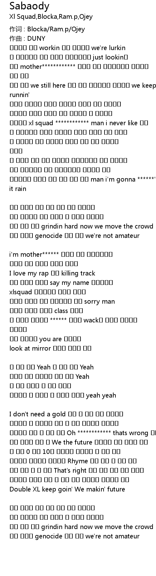 너네들이 뭘 하던간에 내가 갈 길을 개척하고 있는거야 바보들은 나를 욕 하기 바빠 Oh ************ thats wrong 오직 내 곳 하나 만들어 가는 중 We the future 너네들은 그냥 보기만 하면 돼 우린 0 에서 10을 만들어가 아무것도 못 하는 놈들 우리처럼 반만해봐 하나마나 Rhyme 하나 살짝 해 봤자 새는 박자 가늠 할 수 없지 That's right 밤낮 하고 낮밤 우린 간단해 너네들이 힘들어 하던 것 들을 우린 계속해서 해내가고 있어 Double XL keep goin' We makin' future |