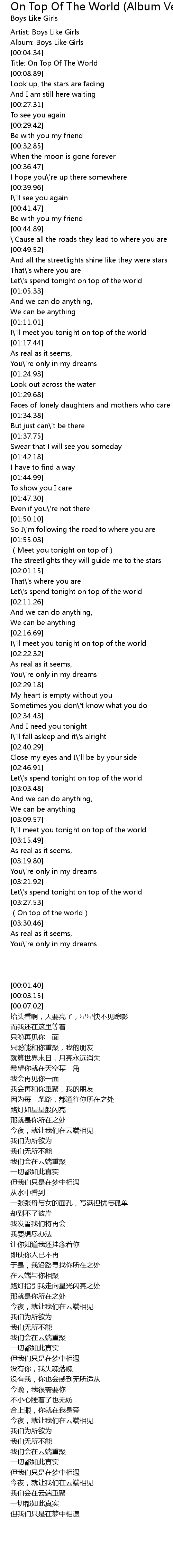 | [00:07.02] | Title: On Top Of The World |