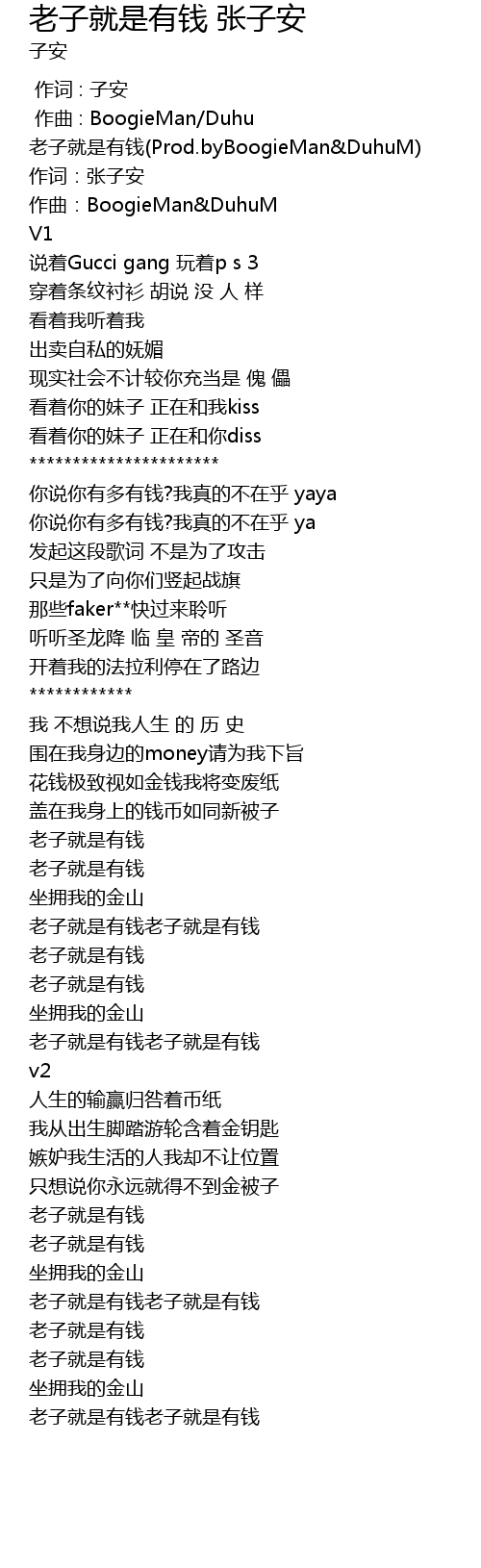 | [00:00.350] | lǎo zi jiù shì yǒu qián Prod. byBoogieMan DuhuM |