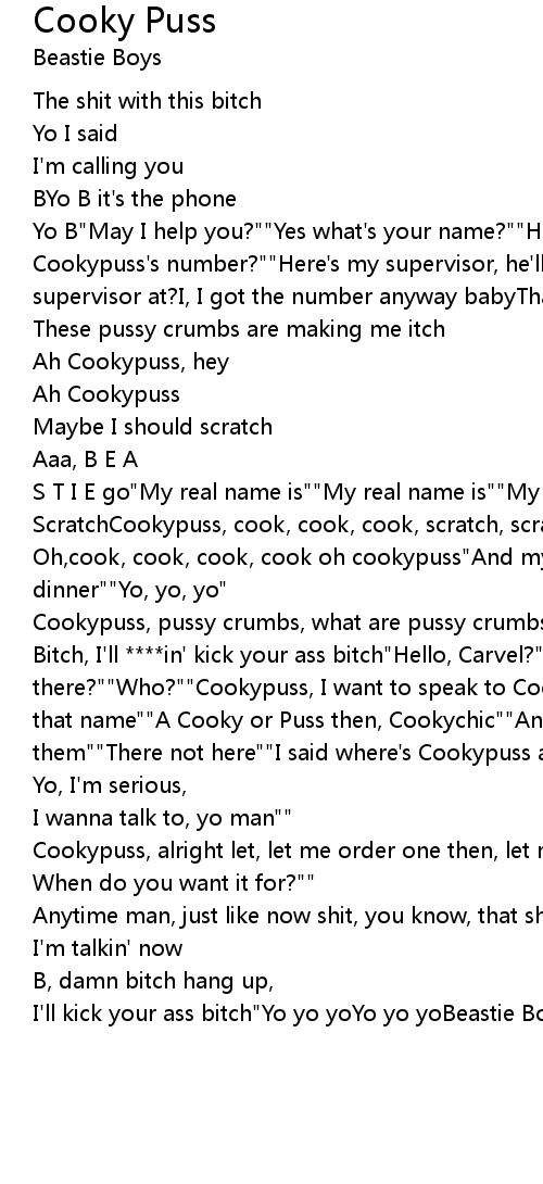 Bitch, I'll ****in' kick your ass bitch"Hello, Carvel?""Yo man Cookypuss there?""Who?""Cookypuss, I want to speak to Cookypuss man""No, Nobody here by that name""A Cooky or Puss then, Cookychic""Anybody man, I want to speak to them""There not here""I said where's Cookypuss at?"