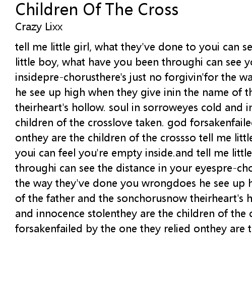 tell me little girl, what they've done to youi can see it in your eyestell me little boy, what have you been throughi can see you're empty insidepre-chorusthere's just no forgivin'for the way they've done you wrongdoes he see up high when they give inin the name of the father and the sonchorusnow theirheart's hollow. soul in sorroweyes cold and innocence stolenthey are the children of the crosslove taken. god forsakenfailed by the one they relied onthey are the children of the crossso tell me little girl what they've done to youi can feel you're empty inside.and tell me little boy, what have you've been throughi can see the distance in your eyespre-chorusthere's just no forgivin'for the way they've done you wrongdoes he see up high when they give inin the name of the father and the sonchorusnow theirheart's hollow. soul in sorroweyes cold and innocence stolenthey are the children of the crosslove taken. god forsakenfailed by the one they relied onthey are the children of the cross |