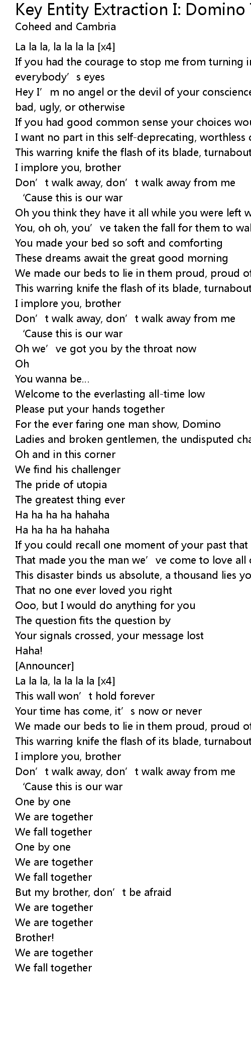 | Song | Key Entity Extraction I: Domino The Destitute |
