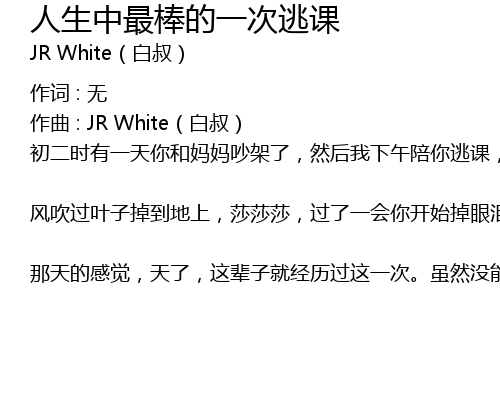 | chū èr shí yǒu yì tiān nǐ hé mā mā chǎo jià le, rán hòu wǒ xià wǔ péi nǐ táo kè, wǒ men pǎo dào jiào xué lóu páng biān de xiǎo huā yuán, dà wú tóng shù xià miàn, liǎng gè rén bèi kào zhe bèi zuò zhe, yī jù huà dōu bù shuō | |