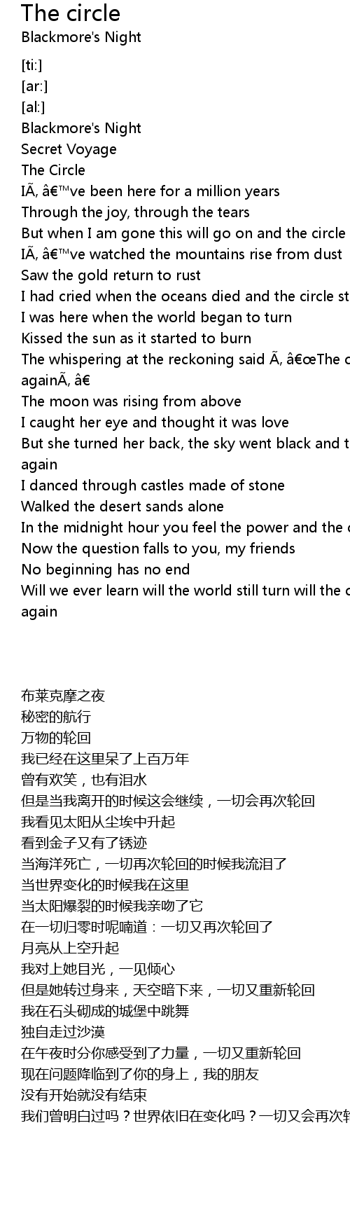 | [01:54.89] | But she turned her back, the sky went black and the circle starts again |