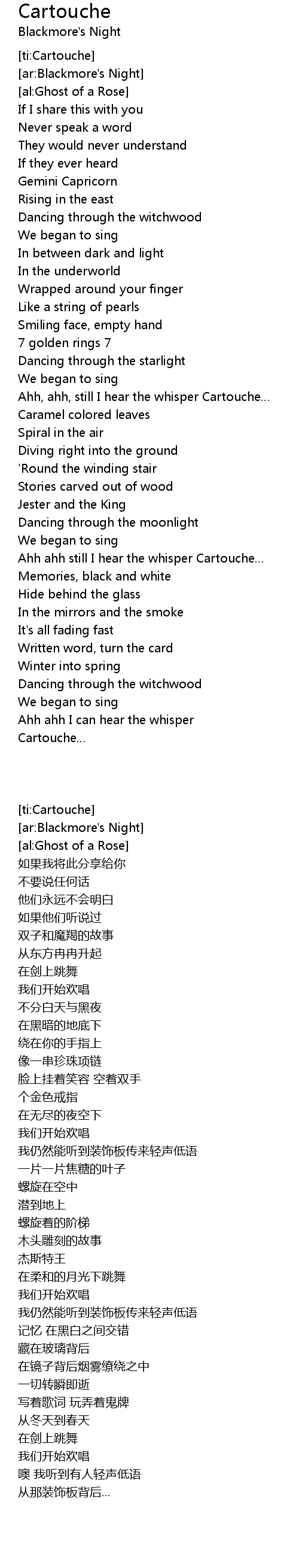 | [01:50.19] | Ahh ahh still I hear the whisper Cartouche… |