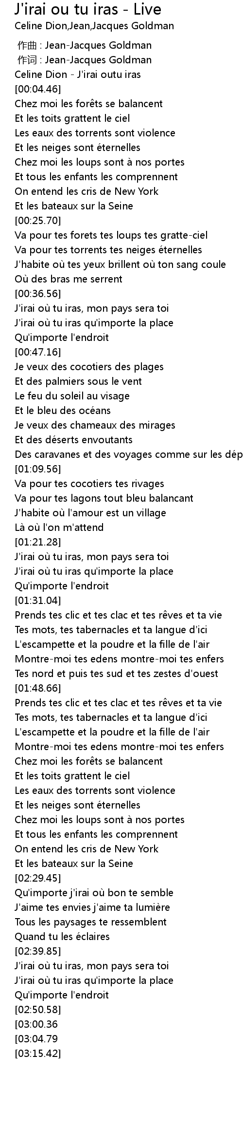 | [03:08.77][03:00.36][02:52.17] | J' irai ou tu iras, mon pays sera toi |