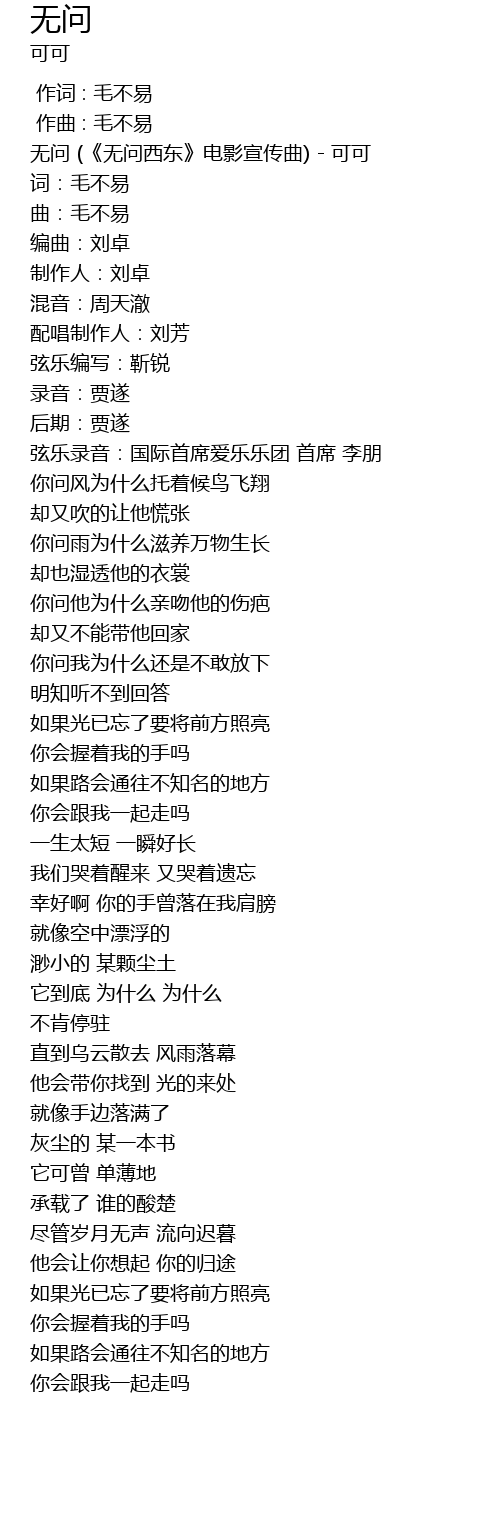 | [00:01.623] | 无问 (《无问西东》电影宣传曲) - 可可 |