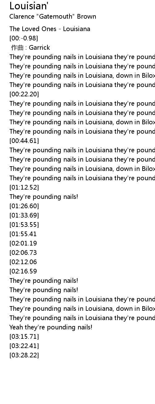 | [00:39.98] | They're pounding nails in Louisiana they're pounding nails |