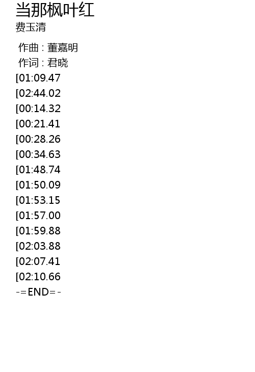 | [02:45.68][01:09.47][00:00.70] | -= 费玉清 《 当那枫叶红 》 =- |