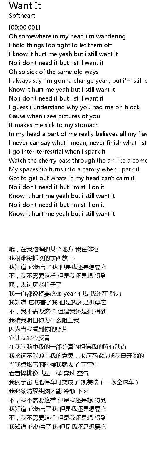 | [01:18.417] | Know it hurt me yeah but i still want it |