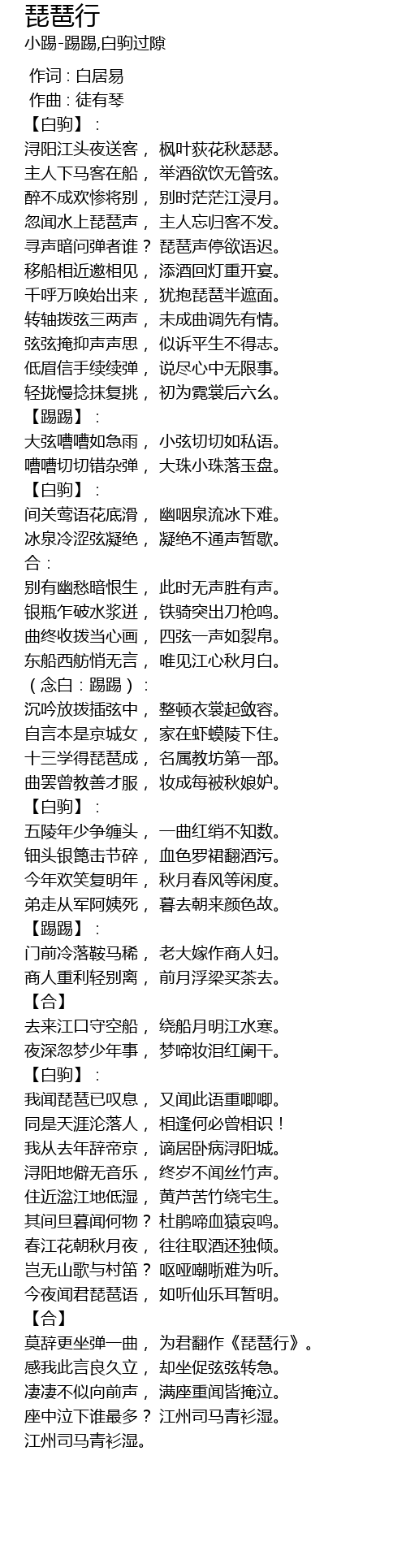 | [04:31.477] | 莫辞更坐弹一曲, 为君翻作《琵琶行》。 |