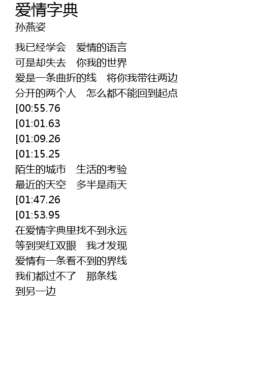 | [02:00.80][00:55.76] | 在爱情字典里找不到永远 |