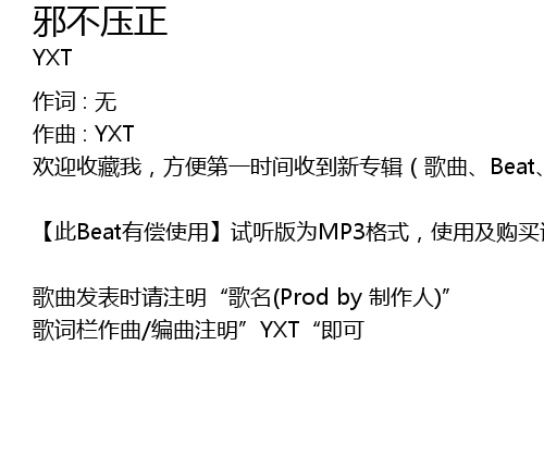 | 歌曲发表时请注明“歌名(Prod by 制作人)” 歌词栏作曲/编曲注明”YXT“即可 |