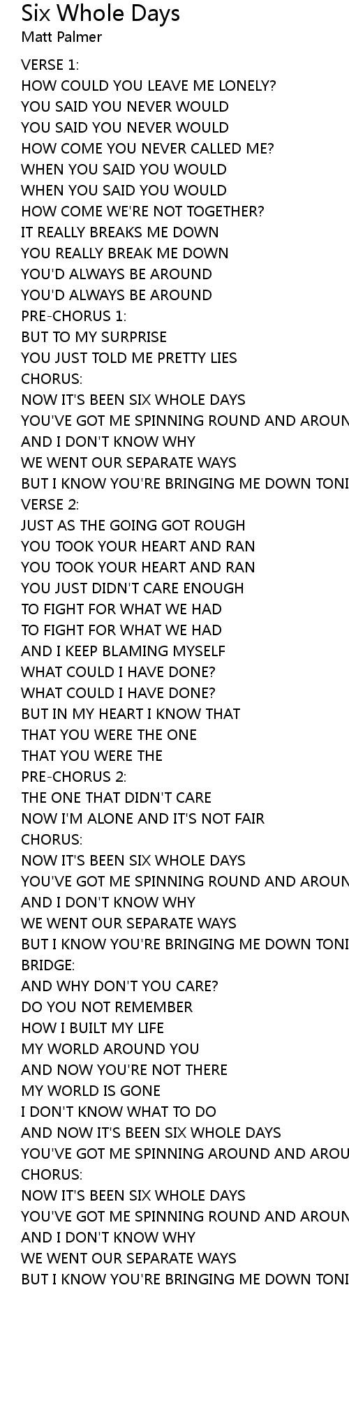 NOW IT'S BEEN SIX WHOLE DAYS |
