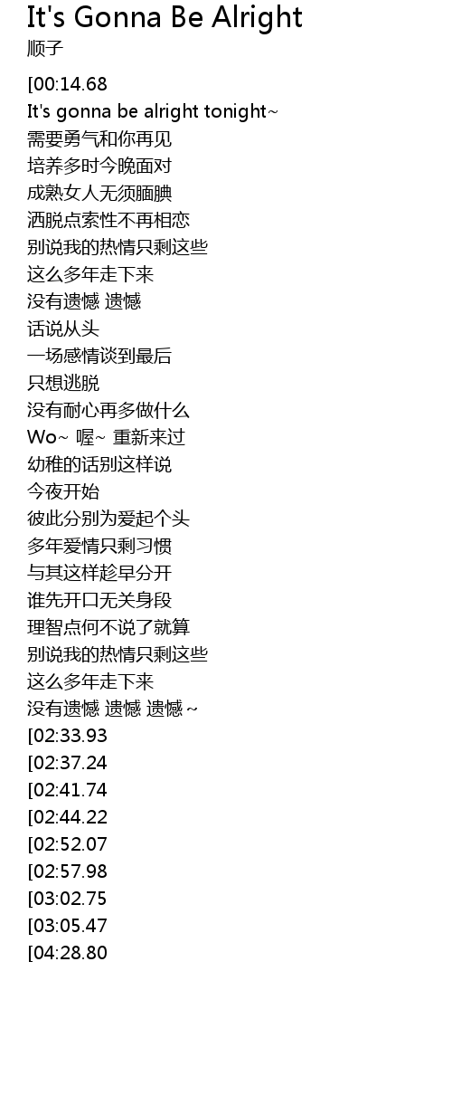 | [00:17.80][00:14.68][00:01.63] | It' s gonna be alright |