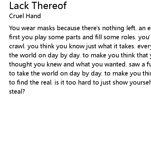 You wear masks because there's nothing left. an empty shell to crumble and fall. first you play some parts and fill some roles. you'll know how it feels to crawl. you think you know just what it takes. everyday a different face. to take the world on day by day. to make you think that you're ok. losing everything you thought you knew and what you wanted. saw a future in a magazine and bought it. to take the world on day by day. to make you think that you're ok. i don't want to find the real. is it too hard to just show yourself and what you didn't steal? |