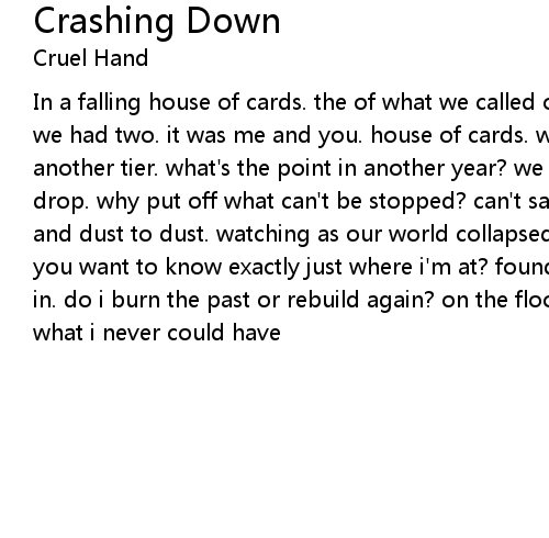 In a falling house of cards. the of what we called ours. i never needed a clue, we had two. it was me and you. house of cards. what it drop. tried hard for another tier. what's the point in another year? we always knew the cards would drop. why put off what can't be stopped? can't say that i had enough. ash to ash and dust to dust. watching as our world collapsed. would we ever want it back? you want to know exactly just where i'm at? foundation dropped. the walls fall in. do i burn the past or rebuild again? on the floor picking up the pieces of what i never could have |