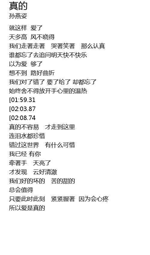 | [02:51.63][01:59.31] | 真的好爱你 我真的愿意 |