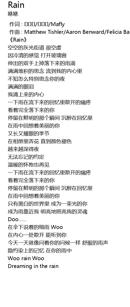 | [03:06.452] | 今天一天就像问着你的问候一样 舒服的雨声 |