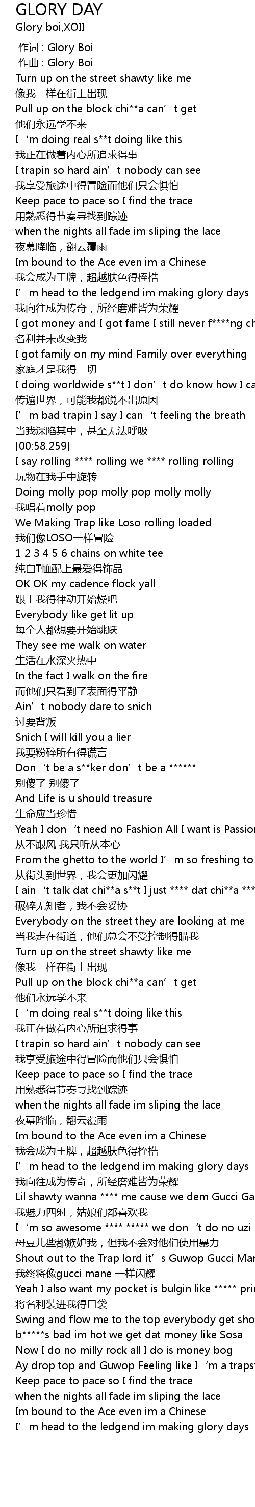 | [03:08.432] | I’m head to the ledgend im making glory days |