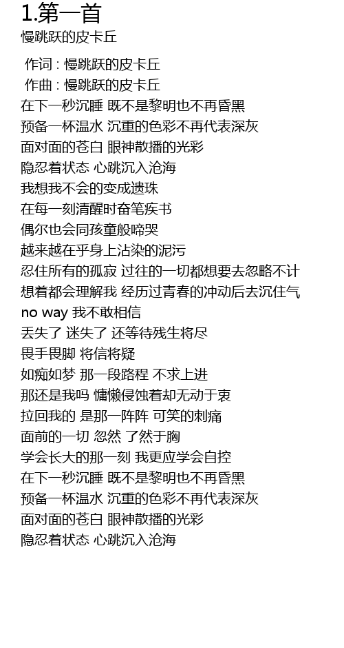 | [00:01.000] | zuò qǔ : màn tiào yuè de pí kǎ qiū |
