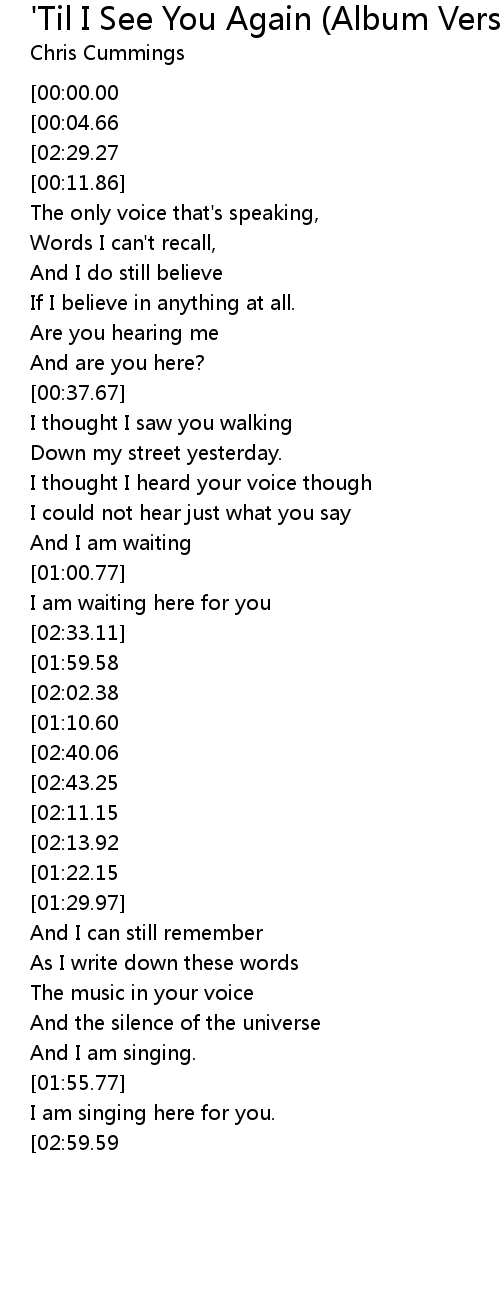 | [02:54.80][02:43.25][02:19.98][02:08.45][01:25.07][01:13.53] | Til' I see you again |