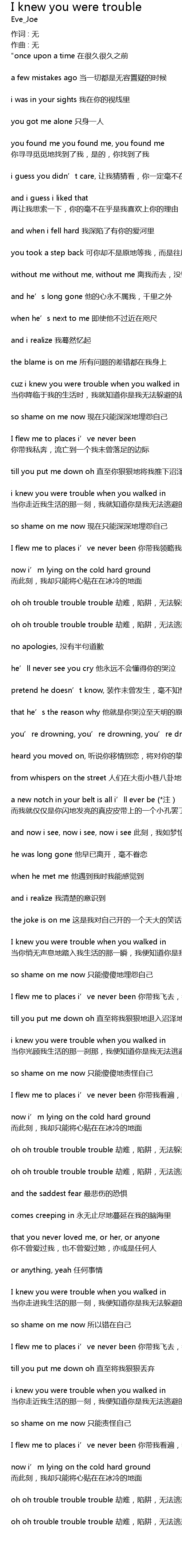 | i knew you were trouble when you walked in dāng nǐ zǒu jìn wǒ shēng huó de nà yī kè, wǒ jiù zhī dào nǐ shì wǒ wú fǎ táo bì de xiàn jǐng | |