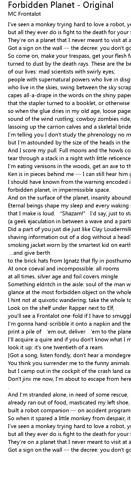 | you' ll see a Frontalot onefold if I have to smuggle it in myself. | |