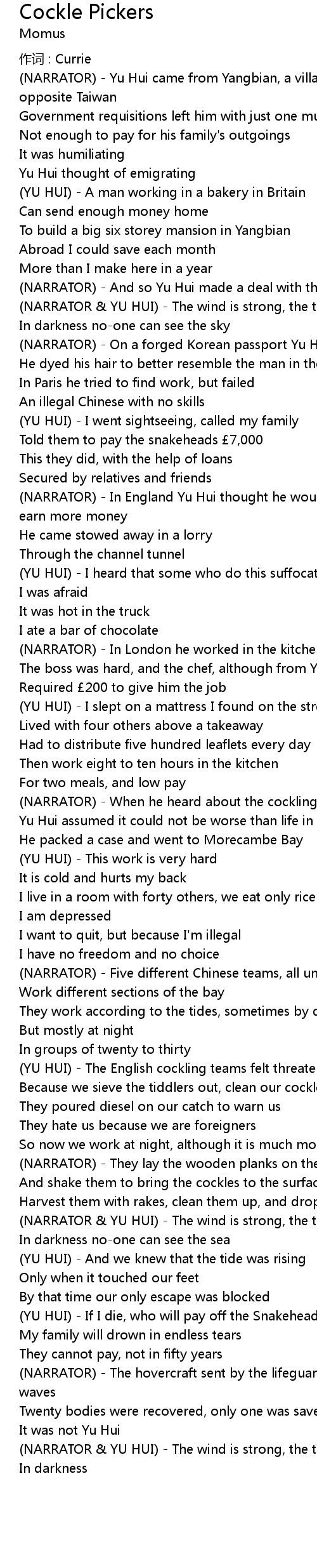 | (NARRATOR) - When he heard about the cockling work up north | |