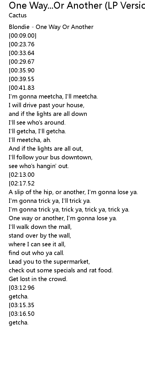 [03:18.26][03:12.96][03:07.00][03:00.91][02:55.11] One way or another, I'm gonna getcha.