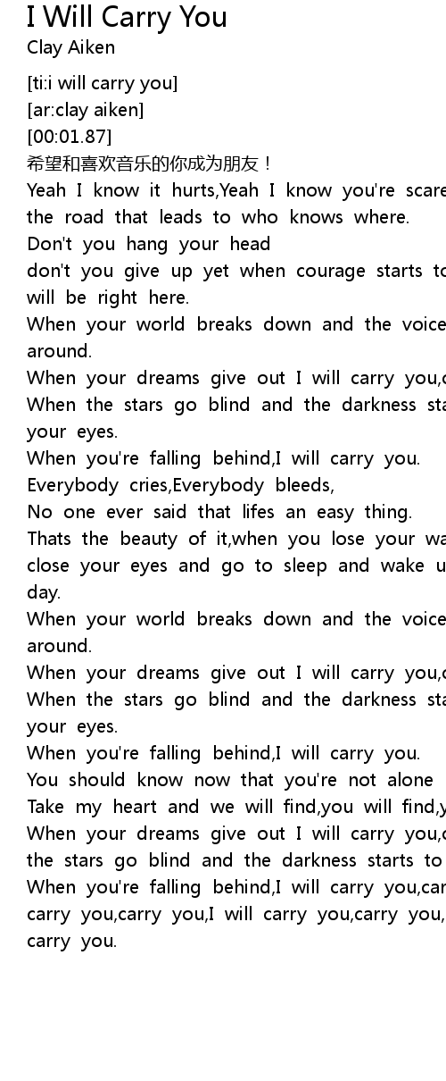 | [03:15.05] | When you' re falling behind, I will carry you, carry you, I will carry you, carry you, I will carry you, carry you, I will |