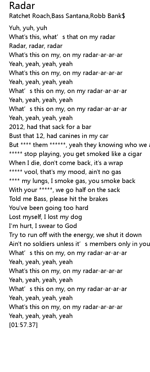 | [01:35.37] | What's this on my, on my radar-ar-ar-ar |