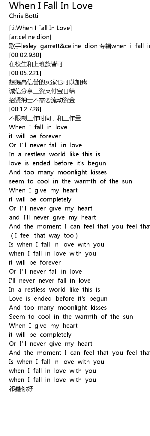 | [00:02.218] | gē shǒu lesley garrett celine dion zhuān jí when i fall in love |