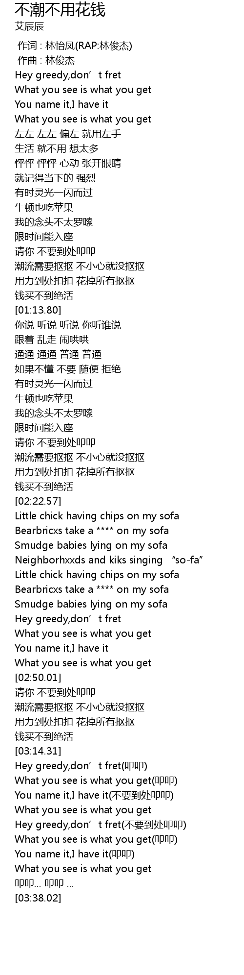 | [03:19.63] | You name it, I have it bú yào dào chù kòu kòu |