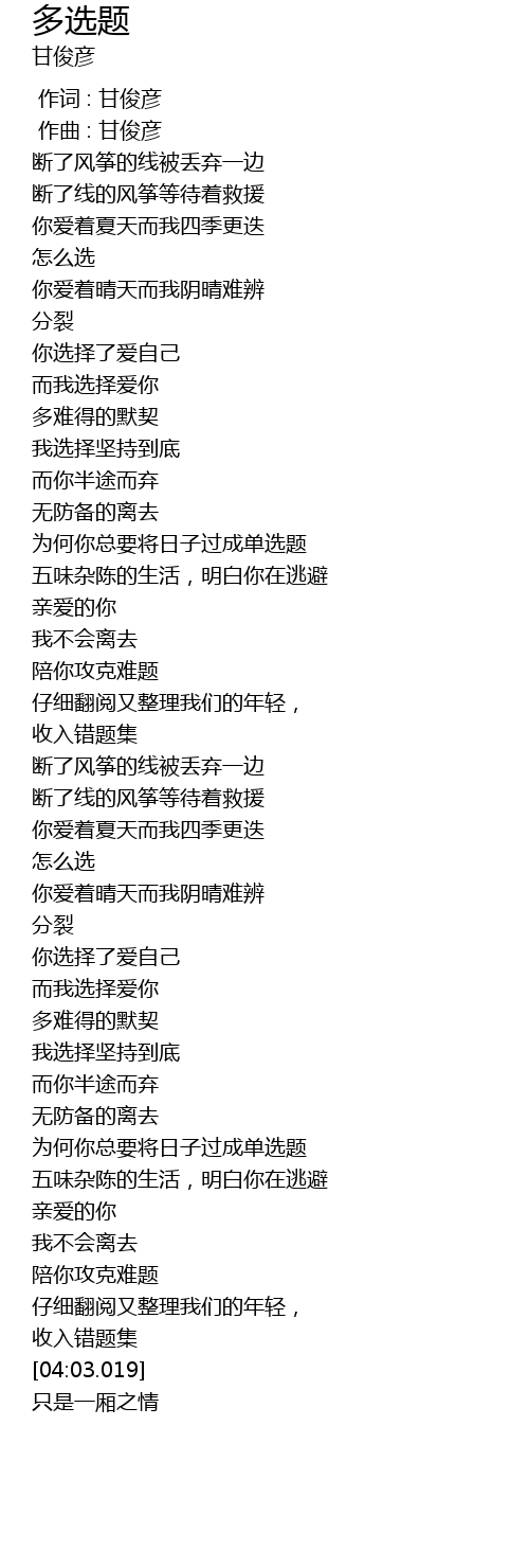 | [03:23.338] | 为何你总要将日子过成单选题 |
