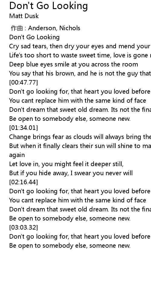 | [02:16.96] | Don' t go looking for, that heart you loved before |