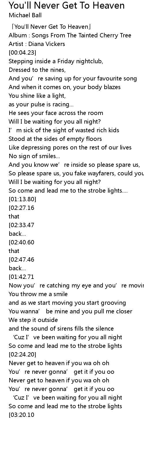 | [03:01.69] | Never get to heaven if you wa oh oh |