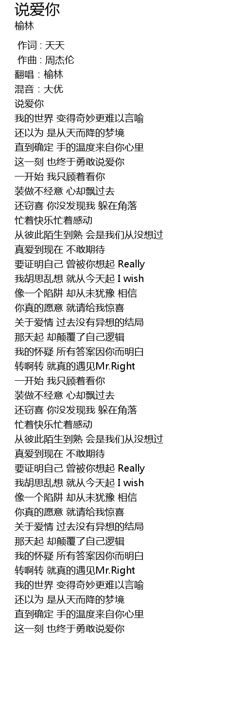 | [00:36.667] | zhe yi ke ye zhong yu yong gan shuo ai ni |