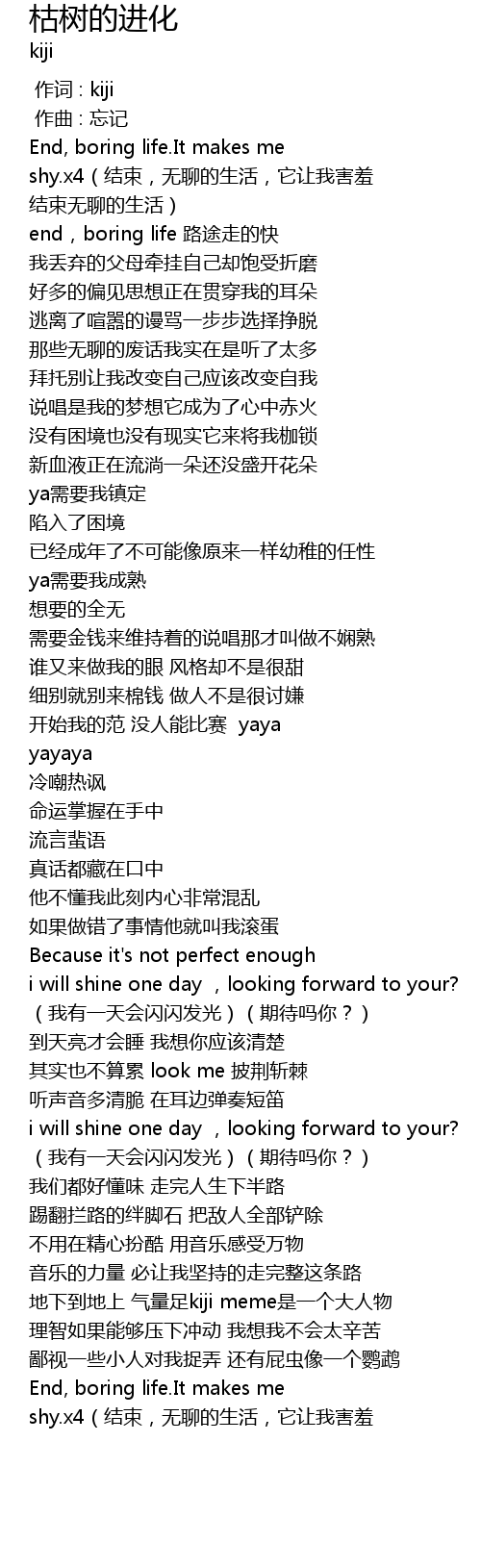 | [00:14.683] | End, boring life.It makes me shy.x4(结束,无聊的生活,它让我害羞 |