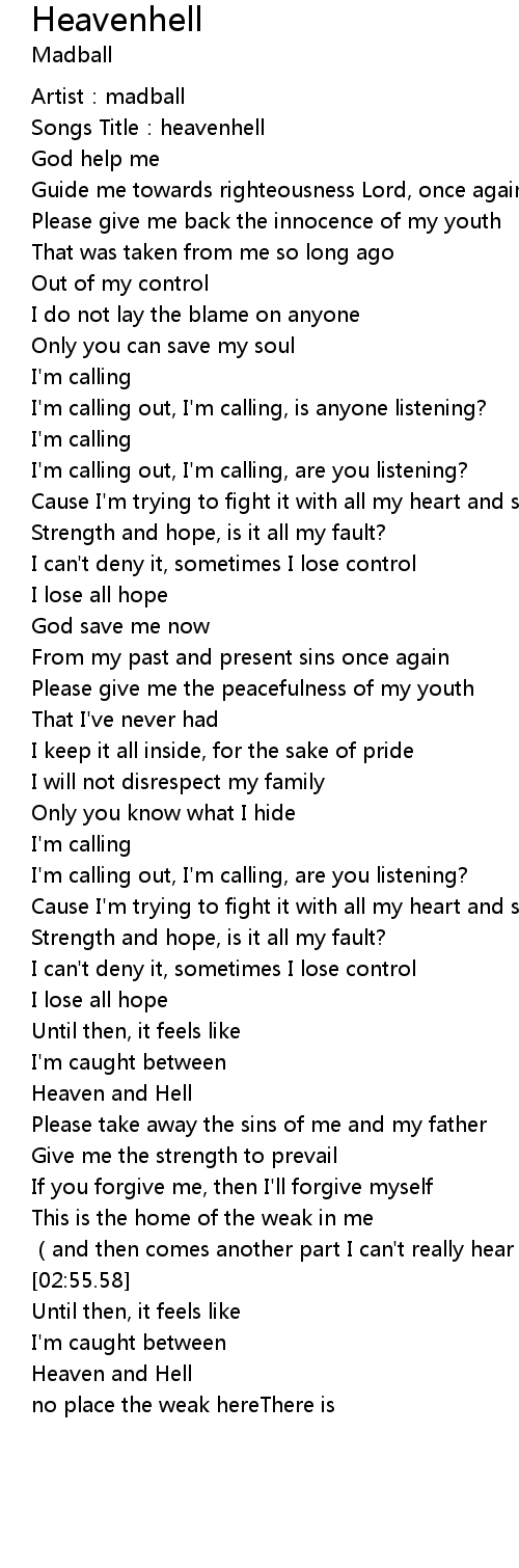 | [02:14.45] | Strength and hope, is it all my fault? |