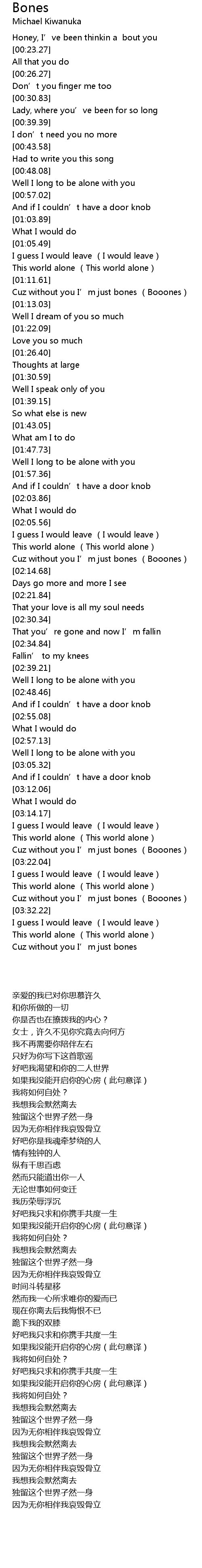| [03:38.60] | Cuz without you I' m just bones |
