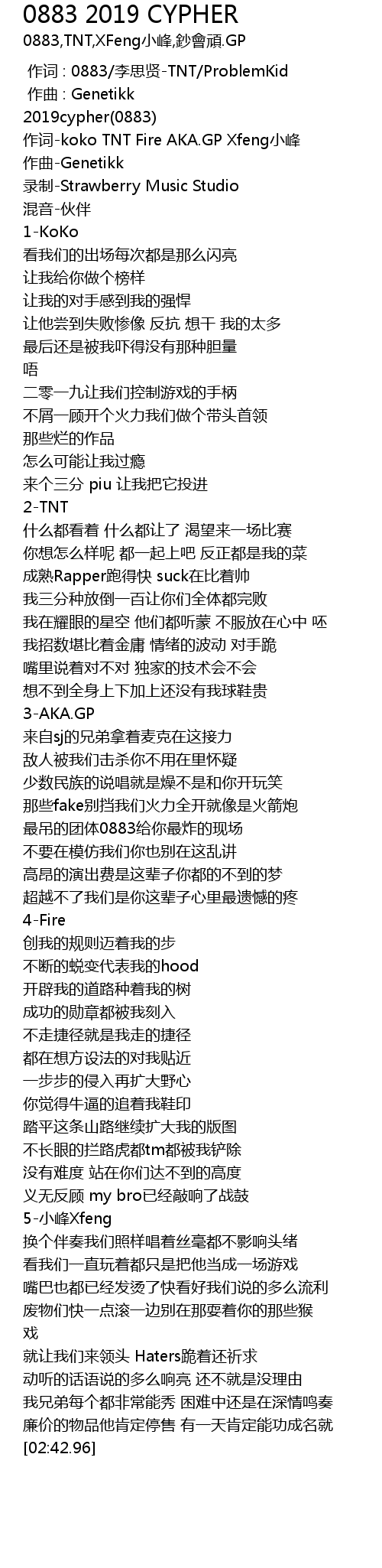 | [00:06.04] | 作词-koko TNT Fire AKA.GP Xfeng小峰 |