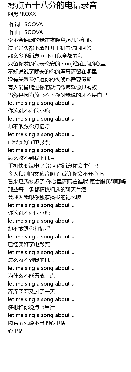 | [00:38.298] | 只留你发的代表晚安的emoji留在我的心里 |