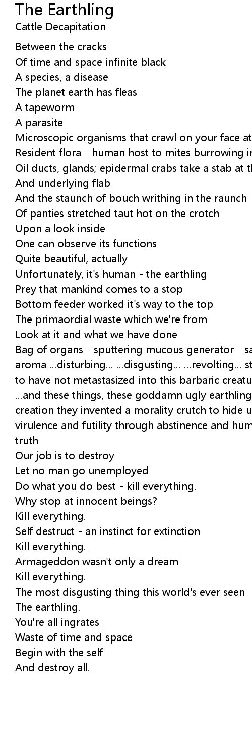 Bag of organs - sputtering mucous generator - saliva on skin - sniff your own aroma ...disturbing... ...disgusting... ...revolting... structure of cells best to have not metastasized into this barbaric creature that you know as yourself ...and these things, these goddamn ugly earthlings they tried to put a face on creation they invented a morality crutch to hide us from our own nature one of virulence and futility through abstinence and humility how dare they hide the truth