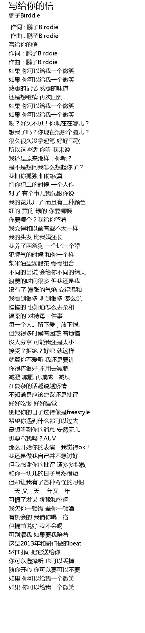 | [00:01.99] | xiě gěi nǐ de xìn |